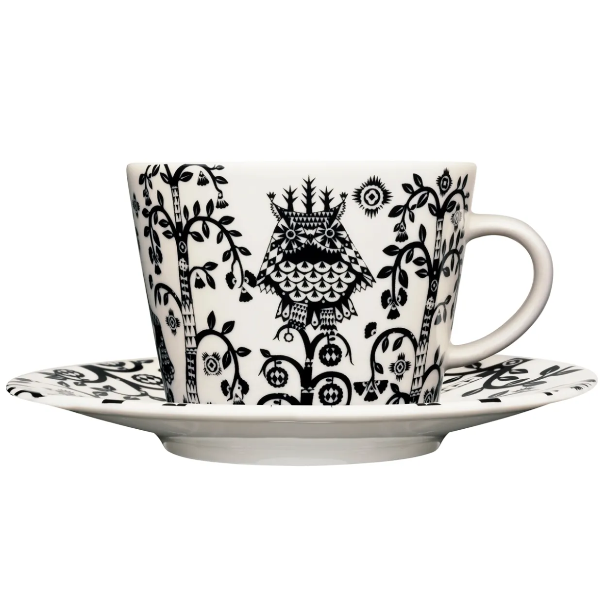Taika (magi på finska) är en lekfull blandning av Klaus Haapaniemis mycket fantasifulla konst och Heikki Orvolas rena design. Resultatet är en magisk serie som inspirerar till kreativitet och sagoberättande i en enkel och ren design. De färgstarka karaktärerna livar upp vardagen med folklore och sagor: Den tåliga porslinsservisen kan användas till mycket och passar varje dukning. Kaffe-/cappuccinokoppen i Taika-serien ger varje kaffestund en förtrollad touch. Kombinationen av svart och vitt framhäver det rika ugglemönstret runt hela koppen. Matchar det 15 centimeter stora fatet perfekt. Samla på alla delar. Tål mikrovågsugn och maskindisk. En fin födelsedags-, bröllops- eller inflyttningspresent.