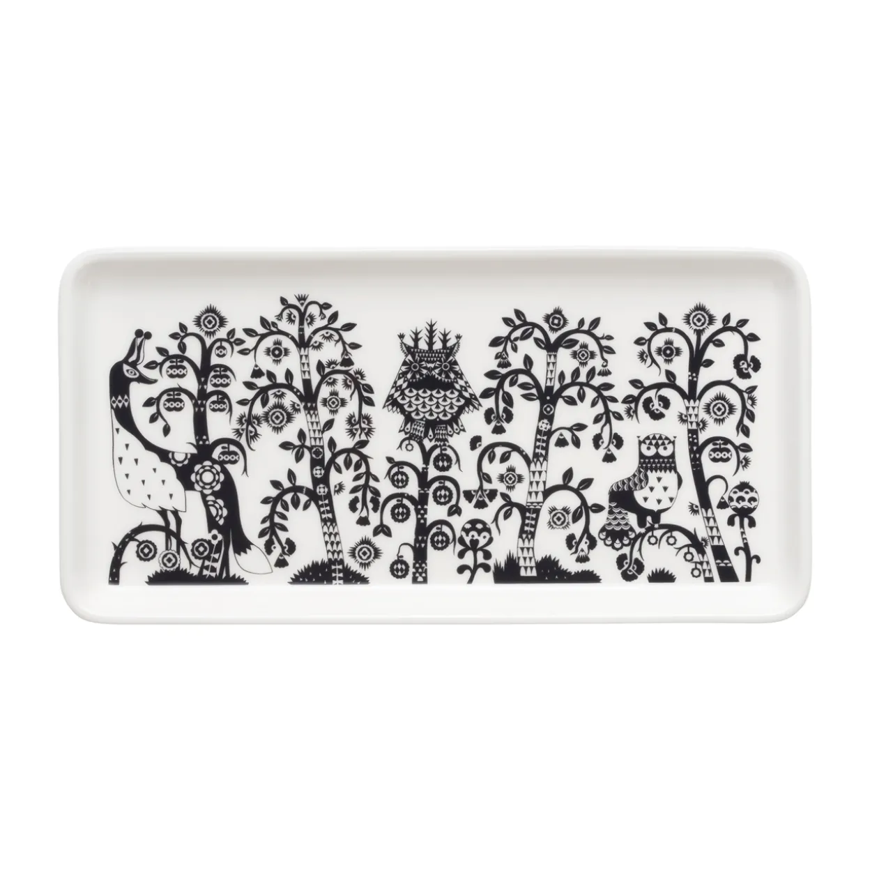 Den rektangulära Taika-tallriken på 12×24 cm passar som både uppläggningsfat och vacker dekoration. Tallriken är enKombination av Klaus Haapaniemis fascinerande konst och Heikki Orvolas minimalistiska former. Denna mångsidiga tallrik är även ett dekorativt inredningsföremål att förvara vackra saker på.