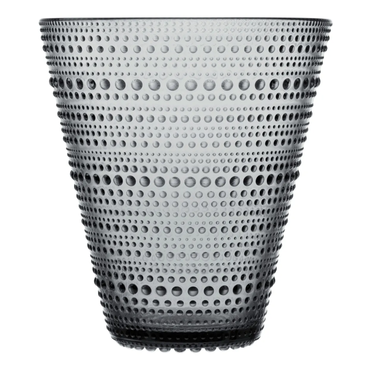 Kastehelmis banbrytande design med glasdroppar skapades när den legendariska finska designern Oiva Toikka sökte efter ett sätt att dölja skarvar i glas. Kastehelmi (finska för ”daggdroppe”) har ringar med glasbubblor som efterliknar strängar med glittrande daggdroppar i morgonsolen. Den populära Kastehelmi-serien består av en mängd lekfulla delar som är både funktionella och dekorativa. Var och en dessa unika och mångsidiga delar är som vackrast när starkt ljus får spela i glaset och framhäva dess gnistrande skönhet. Kastehelmi-vasen är skir men tålig. Dess enkla design ger en ledig elegans åt alla inredningsmiljöer. Den svala grå färgen framhäver blommorna på ett vackert sätt. Den självklara mittpunkten. En fantastisk bröllops-, födelsedags-, jubileums- eller inflyttningspresent.