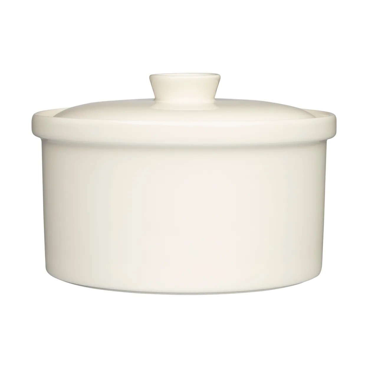 Kaj Francks mångsidiga Teema-kollektion är det definitiva uttrycket för tidlös design. Kollektionen bygger på tre enkla former: cirkel, kvadrat och rektangel och var radikal i sin enkelhet på den tiden. Den nya vita grytan med lock firar 70-årsjubileet av kollektionen. Säker för ugn, frys, diskmaskin och mikrovågsugn är grytan är det perfekta multifunktionella komplementet till din egen servis. Den vita färgen är lätt att kombinera med andra färger och kollektioner, vilket gör den till den perfekta gåvan för kommande generationer.