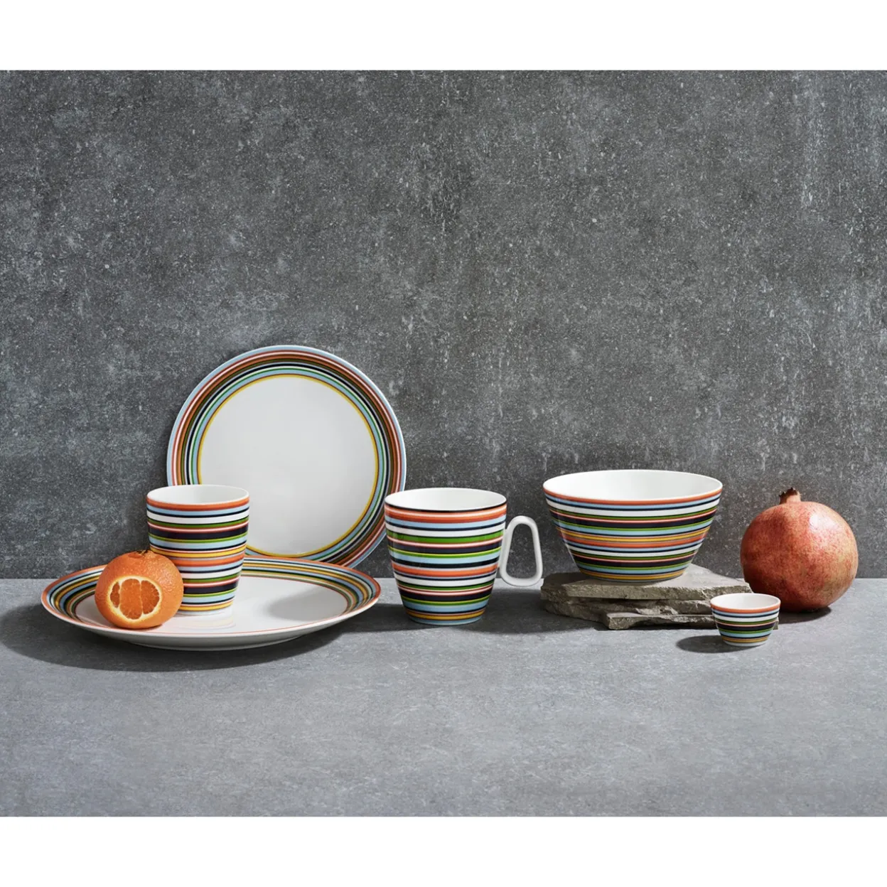Den välkända produktdesignern Alfredo Häberli skapade Origo i avsikt att designa en mångsidig serie med många funktioner. Serien har ultrapraktiska detaljer som ringar för stapling av delar och möjlighet att fästa koppar och skålar i fat och tallrikar. Tillverkad av ett vackert porslin som är både praktiskt och tillräckligt tåligt för vardagsbruk. Randmönstren i livfulla färger ger serien en kraftfull och modern accent. Mixa och matcha olika delar eller kombinera med delar från andra Iittala-serviser för att skapa effektfulla kombinationer. Möjligheterna är oändliga. Fick den prestigefulla utmärkelsen iF Design Award 2002. Unna dig en mysig stund med kaffe, te eller varm choklad i den stora orange Origo-muggen. Samla på alla delar. En populär present. Tål maskindisk.